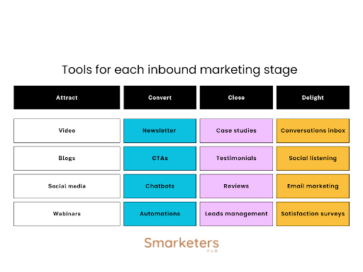 Inbound marketing happens in 4 stages: attract, convert, close, delight. Let’s go a little deeper into each stage.